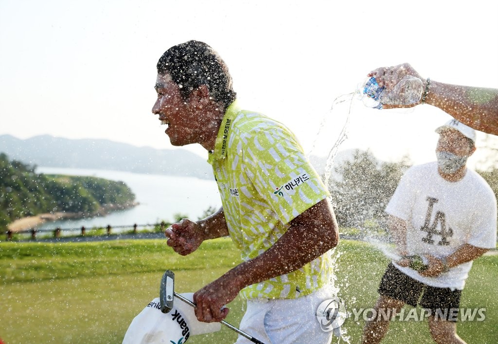 | ▲ 우승 축하 받는 박은신 (서울=연합뉴스) 박은신이 한국프로골프(KPGA) 코리안투어 유일의 매치플레이 대회에서 데뷔 13년 만에 첫 우승의 꿈을 이뤘다. 박은신은 22일 경남 거제 드비치 골프클럽에서 열린 KPGA 코리안투어 제12회 데상트코리아 먼싱웨어 매치플레이 결승전에서 연장 접전 끝에 김민준을 꺾고 '매치킹'에 올랐다. 2022.5.22 [KPGA 제공. 재판매 및 DB금지] photo@yna.co.kr |