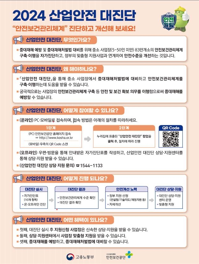 한편 노동부는 지난 29일부터 50인 미만 사업장 83만7천곳을 대상으로 안전보건 관리체계를 구축했는지 스스로 진단하는 '산업안전 대진단'을 추진하고 있다. 진단 결과는 컨설팅과 교육, 기술지도 등 지원사업과 연계된다.