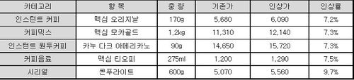 '맥심 오리지날 170g' 리필제품은 5천680원에서 6천90원으로, '맥심 모카골드 커피믹스 1.2kg'은 1만1천310원에서 1만2천140원으로, '맥심 카누 아메리카노 90g'은 1만4천650원에서 1만5천720원으로 출고 가격이 각각 오른다.