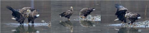 강릉 남대천에서 겨울을 보내고 있는 2마리의 흰꼬리수리가 각기 다른 곳에 앉아 쉬던 중 갑자기 나이 많은 흰꼬리수리가 어린 흰꼬리수리가 쉬는 곳으로 날아갔다.