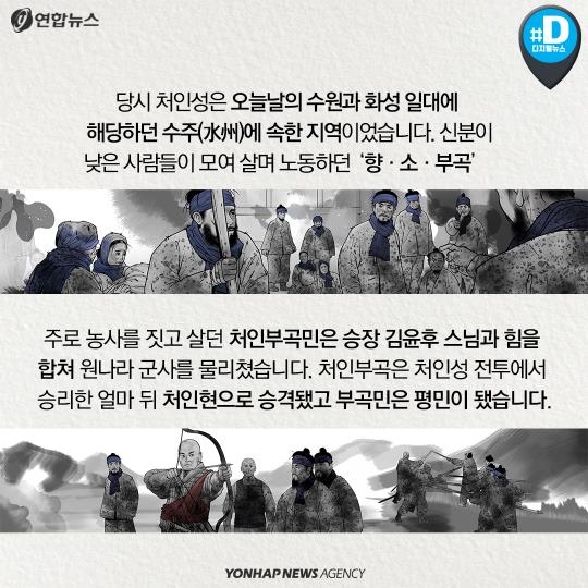 주로 농사를 짓고 살던 처인 부곡민은 승장 김윤후 스님과 힘을 합쳐 원나라 군사를 물리쳤습니다. 처인부곡은 처인성 전투에서 승리한 얼마 뒤 처인현으로 승격됐고 부곡민은 평민이 됐습니다.