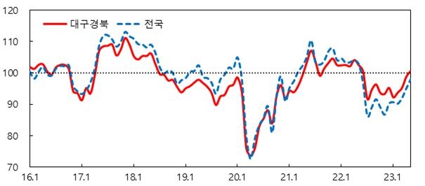 한은 대구경북본부 관계자는 "가계 재정 상황 등에 대한 인식이 좋아지면서 소비자심리지수가 넉 달 연속 상승했다"며 "전국(98.0)보다 높은 수준"이라고 말했다.