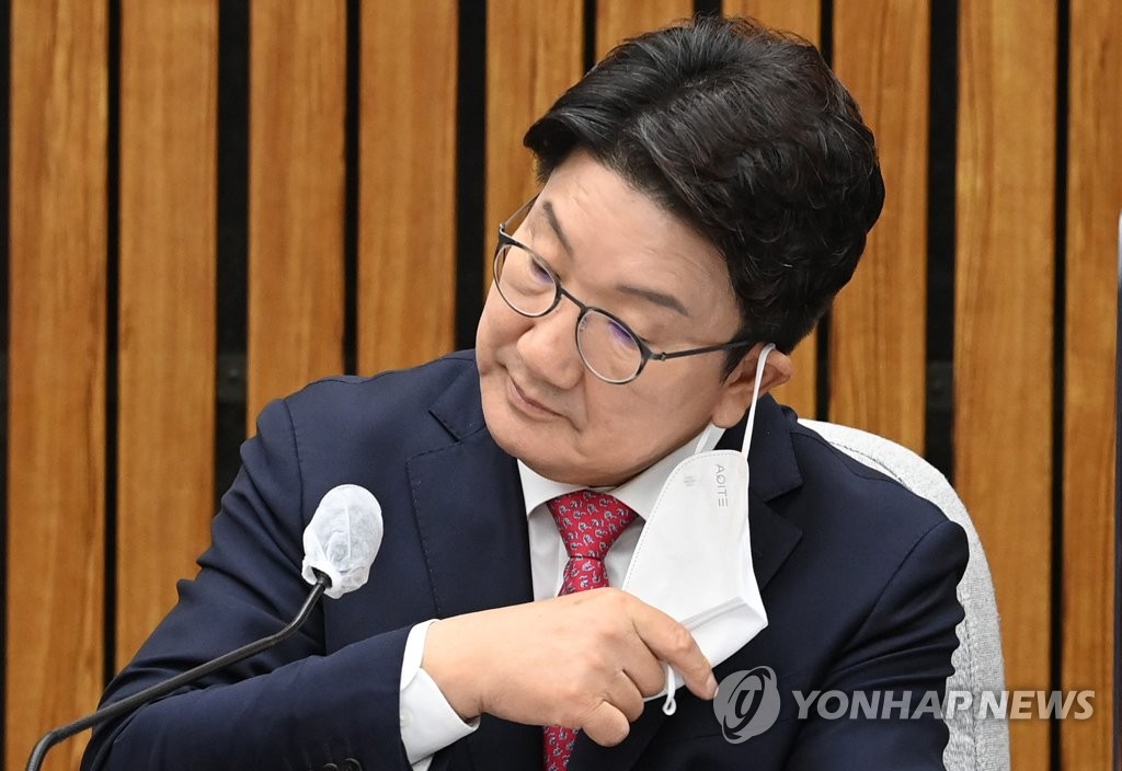 | ▲ The ruling People Power Party's floor leader Kweon Seong-dong takes off his face mask during a party meeting at the National Assembly in western Seoul on Sept. 8, 2022. (Pool photo) (Yonhap) |