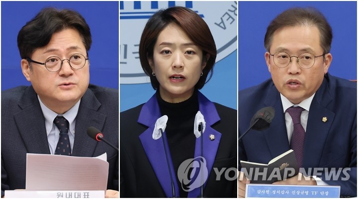 | ▲ This combined photo shows Reps. Hong Ik-pyo, Ko Min-jung and Song Ki-hyun (L to R) from the Democratic Party who won party tickets on Feb. 15, 2024, to run for the parliamentary elections. (Yonhap) |