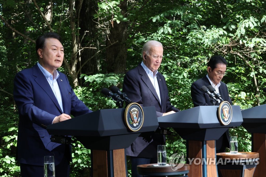 President Yoon Suk Yeol, U.S. President Joe Biden and Japanese Prime Minister Fumio Kishida met at the Camp David presidential retreat in Maryland on Friday, where they adopted a series of documents that outlined their commitments to enhance security and economic cooperation and called for the three countries' leaders to meet annually.