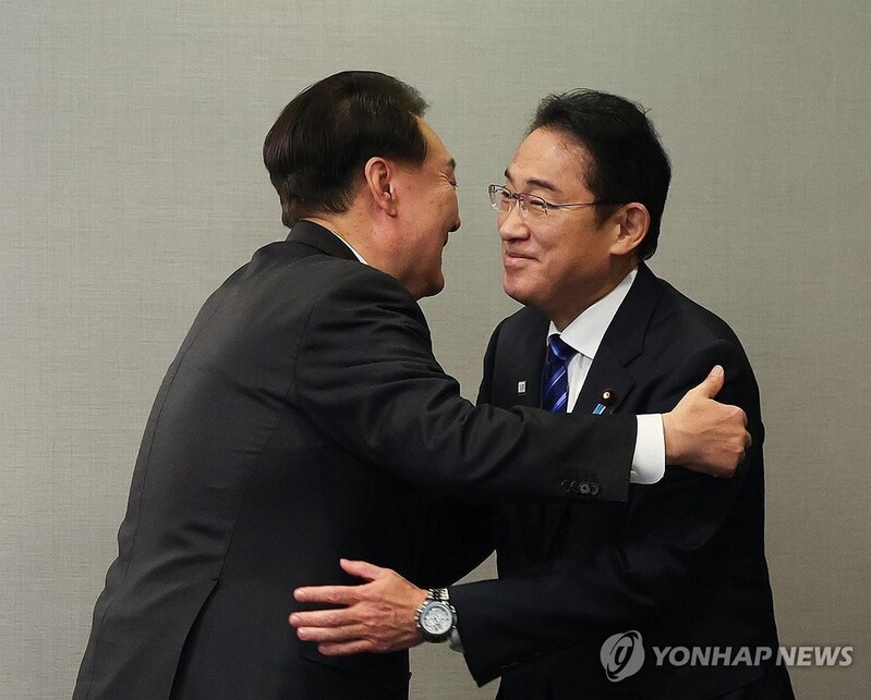 | ▲ South Korean President Yoon Suk Yeol (L) embraces Japanese Prime Minister Fumio Kishida during their talks in San Francisco on Nov. 16, 2023, on the sidelines of a summit of the Asia-Pacific Economic Cooperation forum. (Yonhap) |