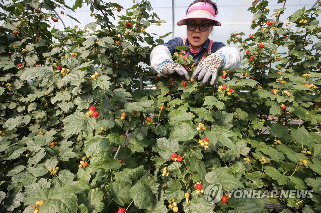 (김해=연합뉴스) 10일 경남 김해시 상동면 여차리 산딸기 농장에서 농민들이 잘 익은 산딸기를 수확하고 있다.