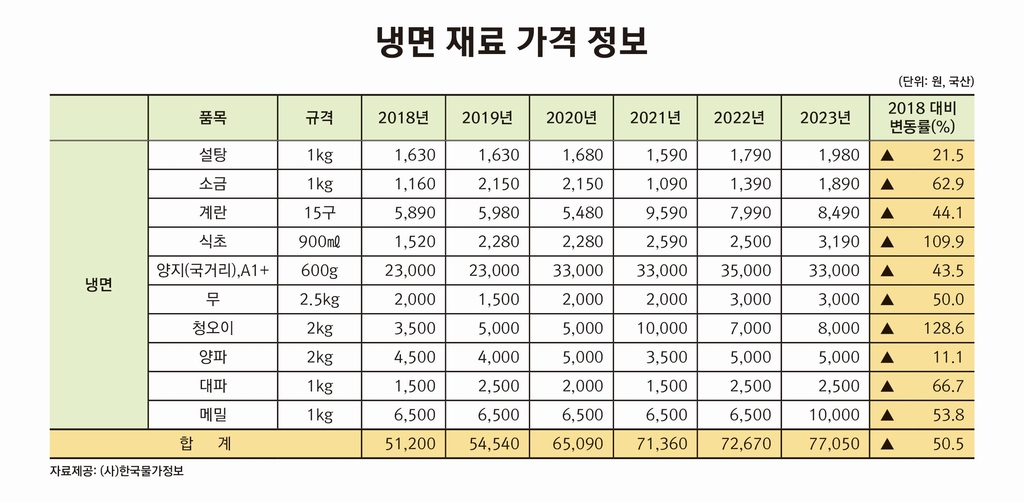 또 냉면에 사용되는 설탕과 소금, 계란, 식초 등 다양한 식재료의 가격도 일제히 올랐다.