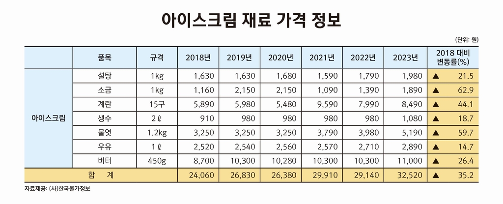 한국물가정보에 따르면 롯데웰푸드[280360]와 빙그레[005180], 해태아이스크림 등 주요 3사에서 생산하는 아이스크림의 소매점 가격은 지난해보다 100∼200원씩 인상됐다.