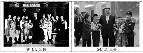 | ▲ This composite image of photos from the Rodong Sinmun, the North's main newspaper, provided by the unification ministry, shows North Korea's late founder Kim Il-sung (center L) and his grandson and incumbent leader Kim Jong-un (center R) attending a performance of students marking New Year's Day in 1994 and 2024, respectively. (PHOTO NOT FOR SALE) (Yonhap) |