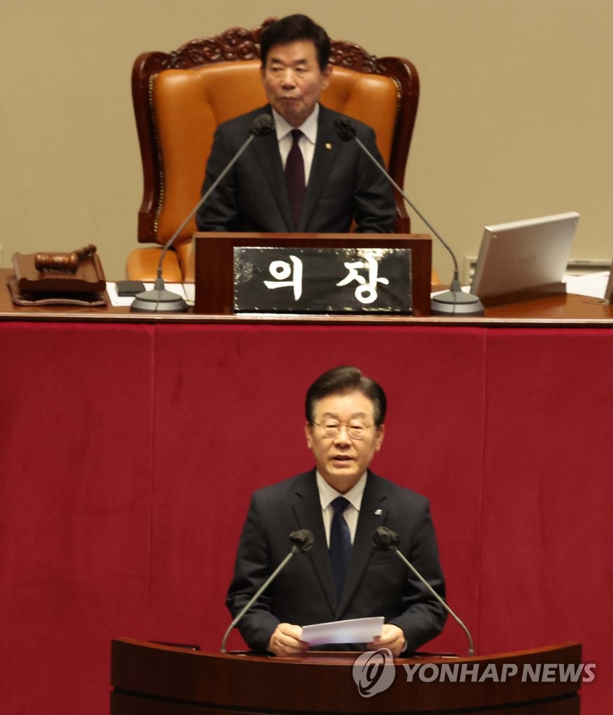 ▲ Rep. Lee Jae-myung (bottom), head of the main opposition Democratic Party, asserts the injustice of the prosecution's request for parliamentary consent to his arrest on a series of corruption charges during a plenary session of the National Assembly in Seoul on Feb. 27, 2023, prior to a parliamentary vote regarding the matter. (Yonhap)