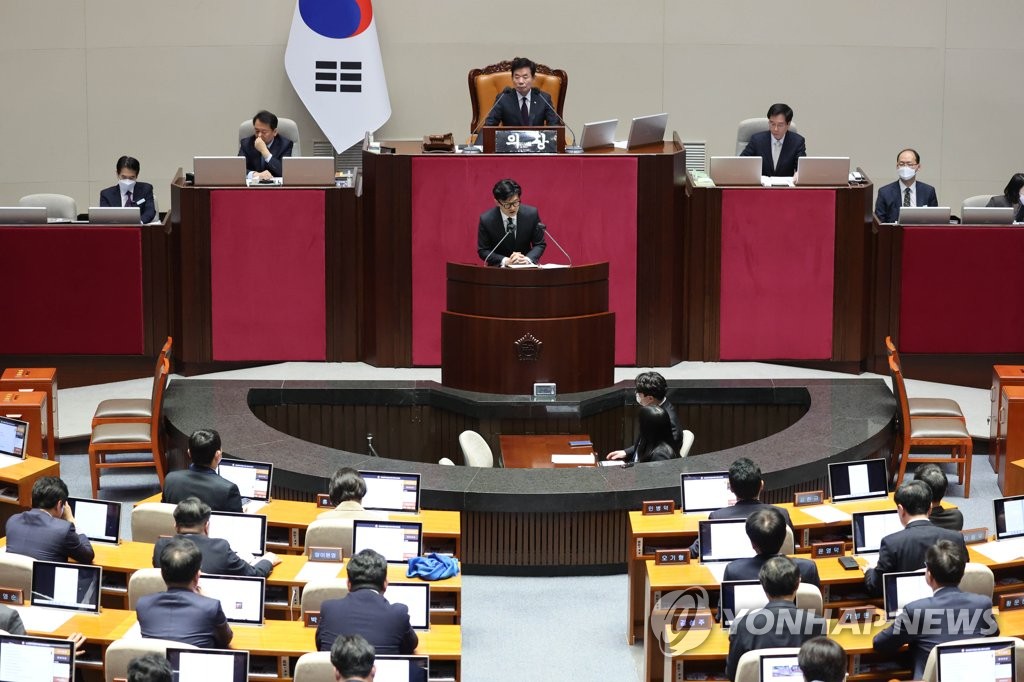 ▲ Justice Minister Han Dong-hoon speaks about reasons for the prosecution's request for parliamentary consent to the arrest of Rep. Lee Jae-myung, head of the main opposition Democratic Party, on a series of corruption charges during a plenary session of the National Assembly in Seoul on Feb. 27, 2023, prior to a parliamentary vote on the matter. (Yonhap)