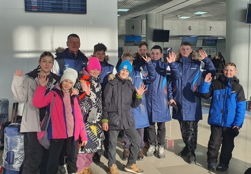 | ▲ Russian youth athletes taking part in a group trip to North Korea pose for a photo at Vladivostok International Airport in Russia's Far East on Feb. 9, 2024. (Yonhap) |