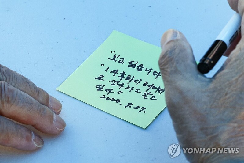 | ▲ This Sept. 27, 2023, file photo shows a member of a family separated by the 1950-53 Korean War writing a message during an event held in Seoul to mark a day commemorating separated families. (Yonhap) |