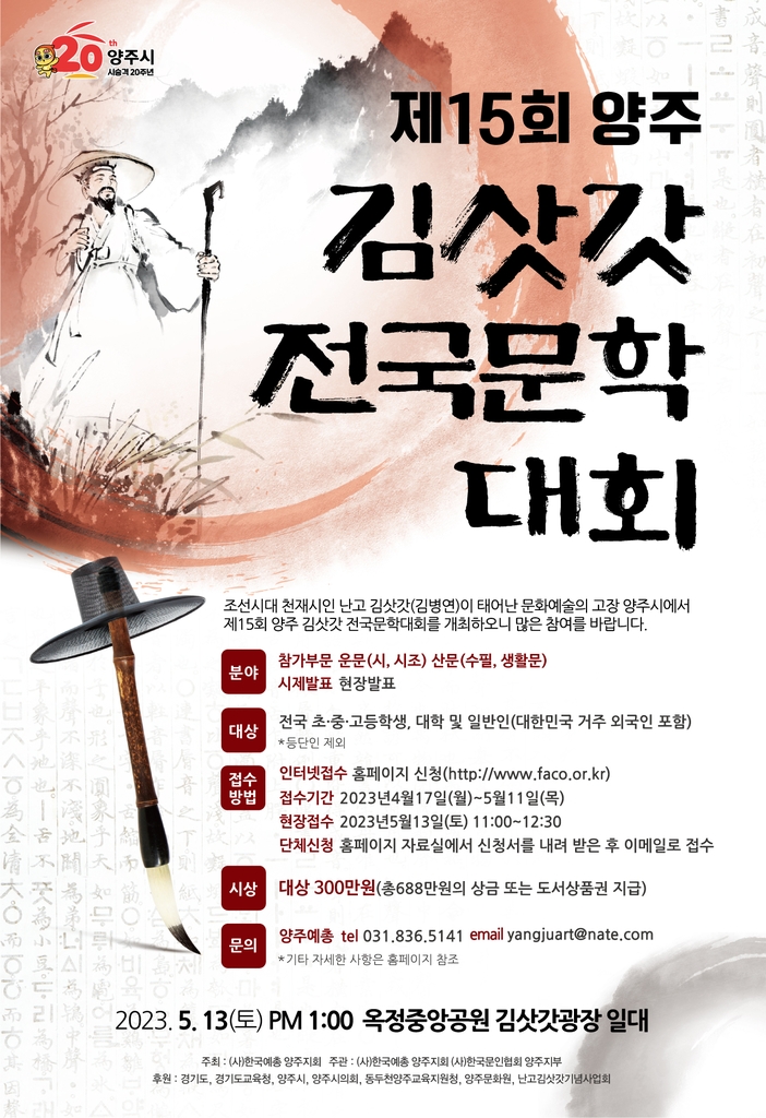 한국예술문화단체총연합회 양주지회가 주최하고 양주시가 후원하는 이번 문학대회는 김병연 선생의 문학적 사상을 계승·발전시키고 문학인을 발굴하고자 마련됐다.