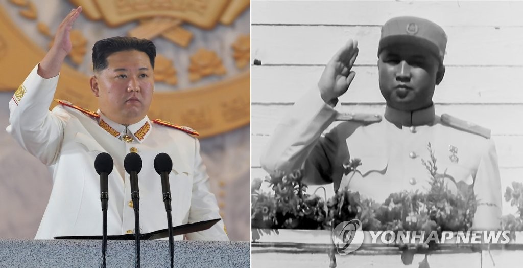 | ▲ 흰색 원수복 입은 김정은과 김일성 (서울=연합뉴스) 김정은 북한 국무위원장(왼쪽)이 지난 25일 열린 조선인민혁명군 창설 90년 기념 열병식에 흰색 원수복을 입고 등장해 병력을 사열하고 있다. 흰색 원수복은 김일성 주석(오른쪽)이 1953년 7월 6·25전쟁 휴전협정 직후 평양에서 전승 열병식을 열었을 때 처음 입고 나타나 최고통수권자의 권위를 단적으로 보여주는 상징으로 주민들 뇌리에 남았다. 이에 북한이 김정은을 김일성과 동일시하며 우상화 수위를 한층 높인 것으로 해석된다. 2022.4.28 [국내에서만 사용가능. 재배포 금지. For Use Only in the Republic of Korea. No Redistribution] nkphoto@yna.co.kr |