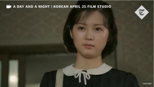 | ▲ 북한 신작 '하루낮 하루밤' (서울=연합뉴스) 조선4·25예술영화촬영소는 2022년 4월 9일 평양국제영화회관에서 열린 시사회에서 예술영화 '하루낮 하루밤'을 공개했다. 사진은 주인공 남영주역의 배우. [영국 텔레그래프 유튜브 캡처] [2022.04.18 송고] |