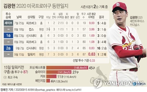 김광현은 15일(한국시간) 미국 위스콘신주 밀워키 밀러 파크에서 열린 2020 미국프로야구 메이저리그 밀워키 브루어스와의 더블헤더(DH) 1차전에 선발 등판해 7이닝 동안 삼진 6개를 곁들여 무실점으로 호투했다.