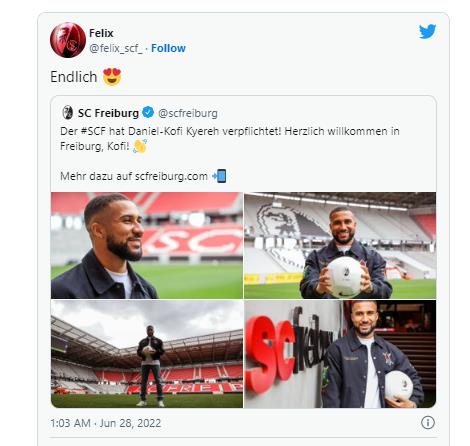 | ▲ 다니엘-코피 체레의 영입을 발표한 프라이부르크. [프라이부르크 구단 SNS. 재판매 및 DB 금지] |