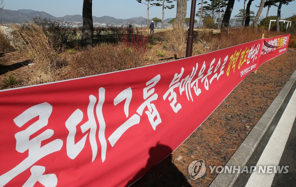 | ▲ 롯데스카이힐 김해CC에 걸린 불매운동 현수막 (김해=연합뉴스) 이정훈 기자 = 20일 경남 김해시 진례면 롯데스카이힐 김해CC에 회원들이 내건 롯데CC 매각반대·불매운동 현수막이 걸려 있다. 2023.2.20 seaman@yna.co.kr |