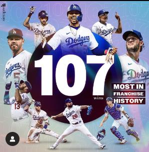 이로써 다저스는 시즌 155경기 만에 107승(48패)을 거둬 2019년과 2021년 달성한 역대 구단 최다승 기록(106승)을 경신했다.
