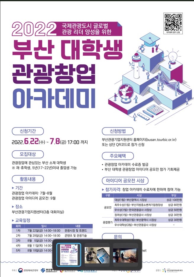 부산시와 문화체육관광부, 한국관광공사가 지원하는 관광 창업 아카데미는 오는 7월 22일부터 8월 19일까지 매주 금요일(4회차 목요일) 오후 2시부터 부산관광기업지원센터에서 진행된다.