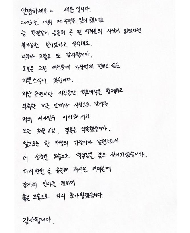 세븐도 자필로 쓴 편지를 게시하며 "지난 8년이란 시간 동안 희로애락을 함께하고 부족한 저를 언제나 사랑으로 감싸준 저의 여자친구 이다해씨와 결혼을 약속했다"며 "앞으로는 한 가정의 가장이자 남편으로서 더 성숙한 모습으로 책임감을 갖고 살아가겠다"고 말했다.