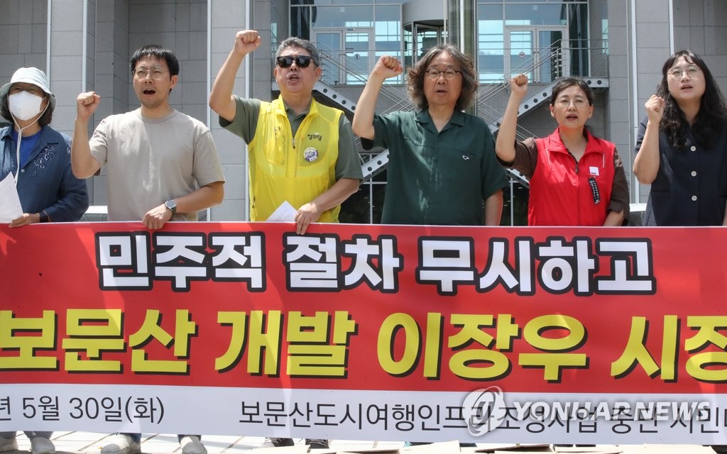 | ▲ 이장우 시장 보문산 개발계획 반대하는 시민단체 보문산도시여행인프라조성사업 중단 시민대책위원회는 지난 5월 30일 대전시청 앞에서 기자회견을 열고 "이장우 대전시장은 보문산 개발계획 전부를 철회하고 민주적 절차에 따른 의견 수렴 결과를 존중하고 이행하라"고 규탄했다. [연합뉴스 자료사진] |