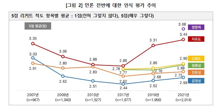 23일 한국언론진흥재단이 발표한 '2021 언론인 조사' 결과에 따르면 기자들이 체감하는 '언론 자유도'는 5점 만점에 3.44점으로 2007년(3.35점) 이후 최고치를 기록했다. 언론 자유도는 2007년 조사 이후 2017년(2.85점)까지 하락세를 보이다가 직전 조사인 2019년(3.31점)부터 상승했다.