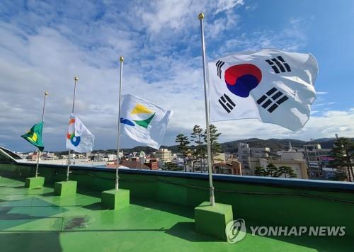 | ▲ (양양=연합뉴스) 이종건 기자 = 지난 29일 밤 발생한 '이태원 압사 참사'와 관련, 오는 11월5일 밤 24시까지 일주일이 국가애도기간으로 지정된 30일 양양군청에 조기가 게양됐다. 2022.10.30 momo@yna.co.kr |