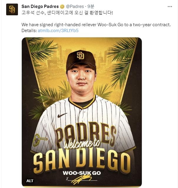 샌디에이고 구단은 공식 소셜미디어 계정을 통해 고우석과 계약 소식을 널리 알렸다.