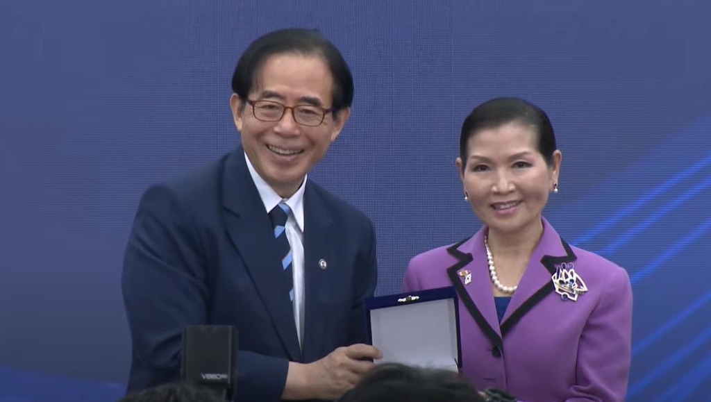 ▲ 김성곤 이사장 유미 호건 여사에 감사패 전달 제주포럼에서 김성곤 재외동포재단 이사장(좌측)이 공공외교에 힘쓴 공로로 유미 호건 미국 메릴랜드 주지사 퍼스트레이디에게 감사패를 전달했다. [재외동포재단 제공]
