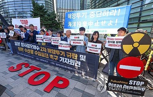 | ▲ Environmental activists stage a rally in Seoul on Oct. 5, 2023, to express their objection to Japan's discharge of radioactive water from the crippled Fukushima nuclear power plant into the sea. (Yonhap) |