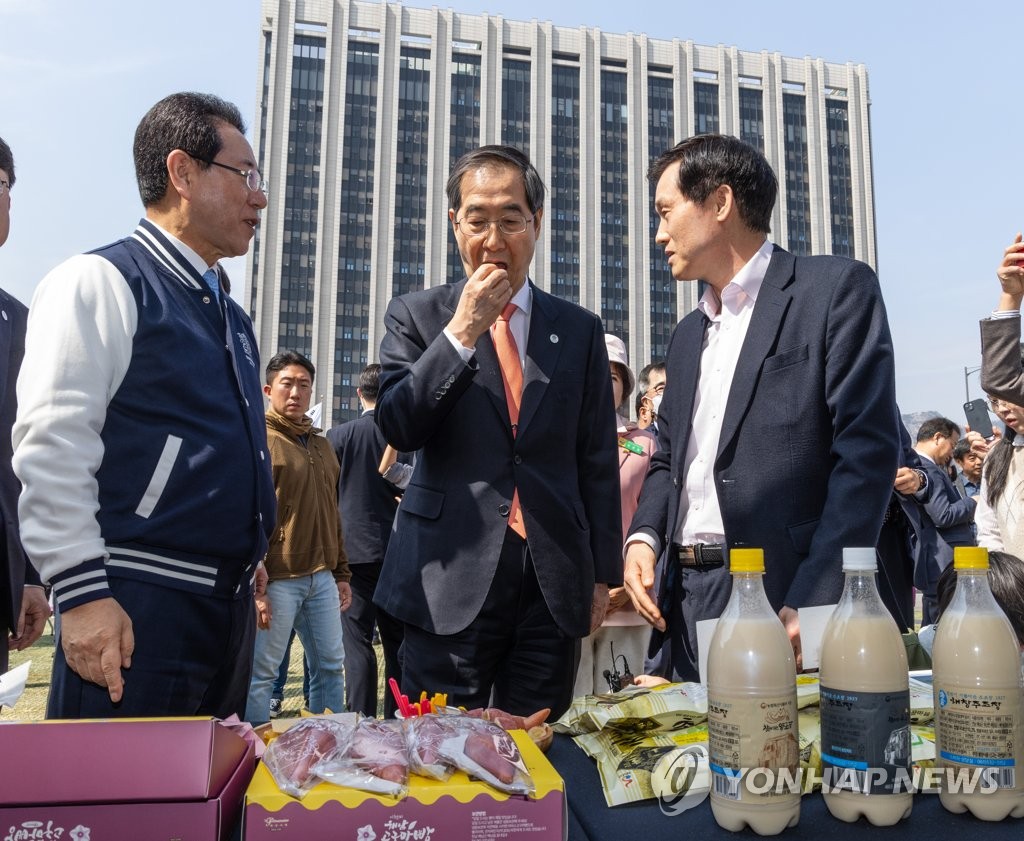 | ▲ Prime Minister Han Duck-soo (C), alongside South Jeolla Gov. Kim Yung-rok (L), eats bread made from potatoes cultivated in Haenam, a town 334 kilometers south of Seoul, in the southwestern province of South Jeolla, as he attends a publicity event in Seoul on March 22, 2023, to promote visits to the province. (Yonhap) |
