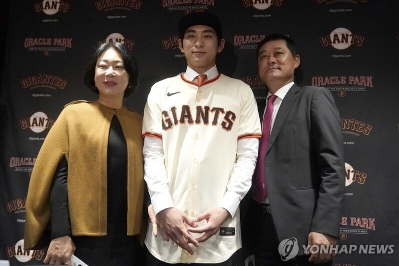 | ▲ 자랑스러운 아들 이정후 (샌프란시스코 AP=연합뉴스) 이정후(가운데)가 15일(현지시간) 미국 캘리포니아주 샌프란시스코 오라클파크에서 열린 샌프란시스코 자이언츠 입단식에서 아버지 이종범(오른쪽) 전 LG 트윈스 코치, 어머니 정연희 씨와 기념 촬영하고 있다. |