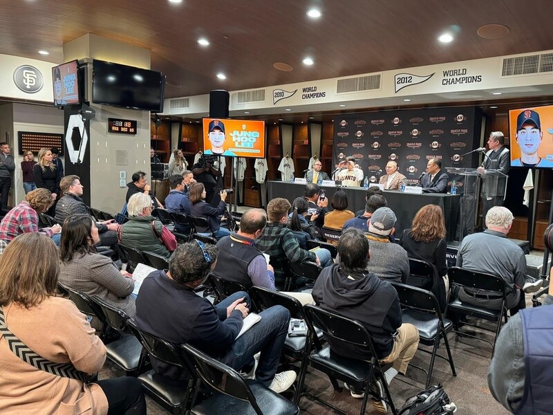 | ▲ 이정후 입단식 (샌프란시스코=연합뉴스) 김태종 특파원 = 이정후가 15일(현지시간) 미 캘리포니아주 샌프란시스코 오라클파크에서 열린 샌프란시스코 자이언츠 입단식 모습. 2023. 12. 15. taejong75@yna.co.kr |