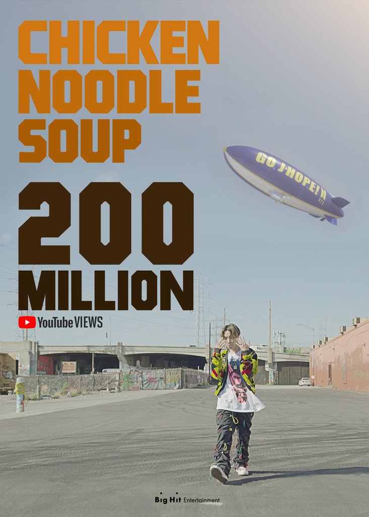 | ▲ This image, provided by Big Hit Entertainment on Oct. 5, 2020, marks 200 million YouTube views for BTS member J-Hope's song "Chicken Noodle Soup." (PHOTO NOT FOR SALE) (Yonhap) |