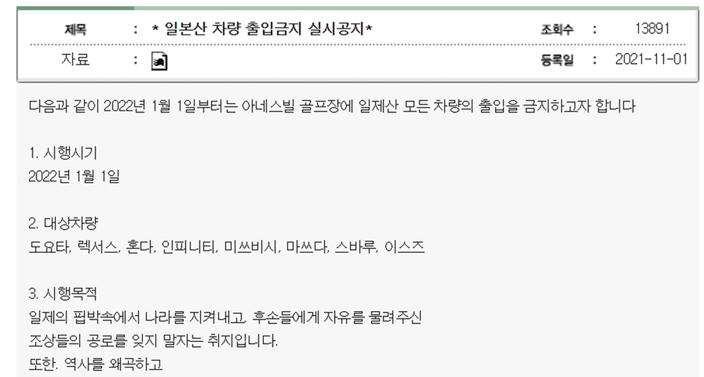 앞서 이 골프장은 지난 1일 "내년 1월부터 모든 일제 차량의 골프장 출입을 막겠다"고 공지해 관심을 받고 있다.