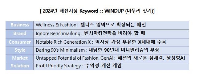 W는 비즈니스 관점에서 웰니스 영역으로 확장되고 있는 패션(Wellness·Fashion) 트렌드를, I는 브랜드 관점에서 벤치마킹 전략을 버려야 할 때(Ignore Benchmarking)라는 점을 각각 의미한다.
