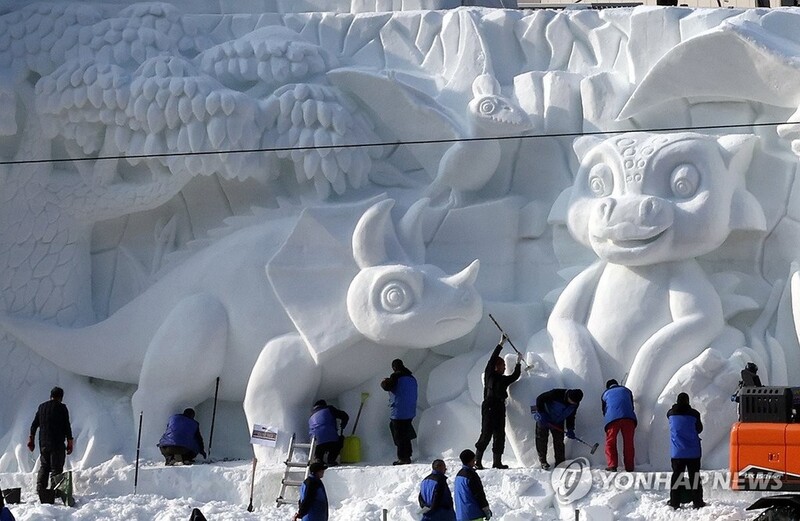 각종 프로그램 및 조형물도 마무리돼 낚시터 앞에 공룡과 고래, 요정 등이 새겨진 초대형 눈 조각 작품이 모습을 드러냈다.