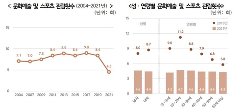 코로나19로 공연과 스포츠 경기가 중단되고 관람 인원이 제한된 영향으로 지난해 문화예술·스포츠 관람 횟수는 평균 4.5회에 그쳤다.