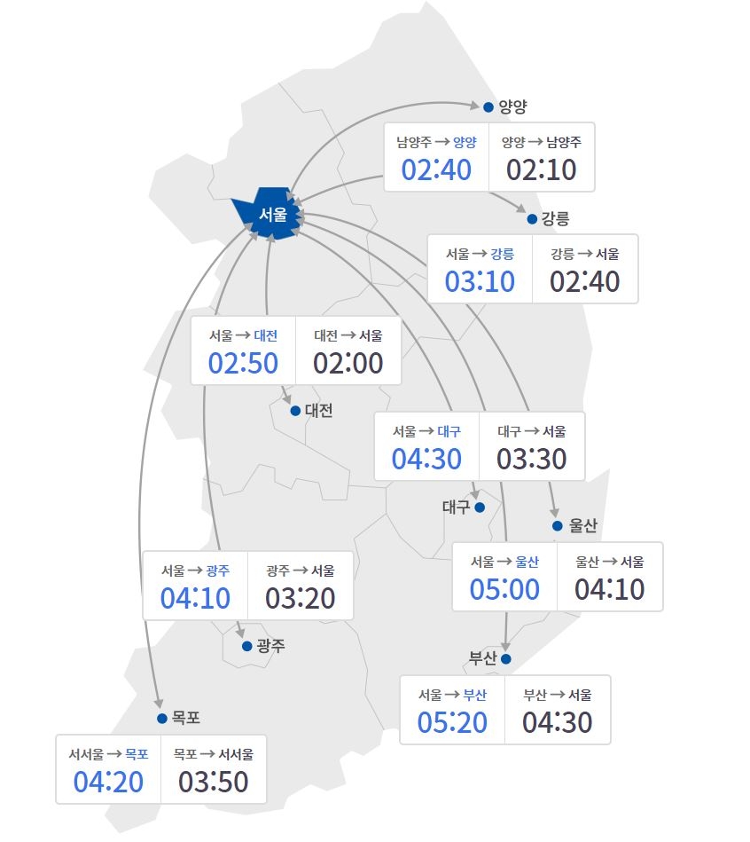 오후 3시 기준 승용차로 서울 요금소를 출발해 전국 주요 도시까지 걸리는 시간은 부산 5시간 20분, 광주 4시간 10분, 울산 5시간, 대구 4시간 30분, 대전 2시간 50분, 강릉 3시간 10분이다.