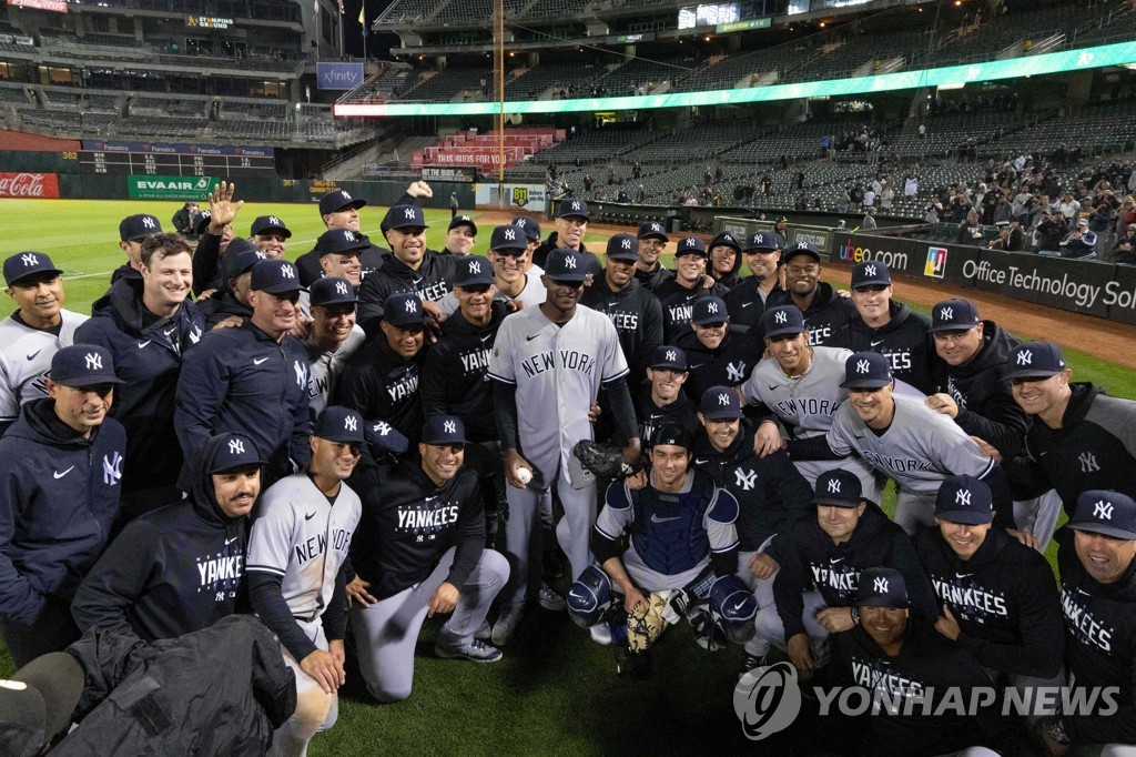 | ▲ 퍼펙트게임 달성한 헤르만 중심으로 기념사진 찍은 양키스 선수단 [USA 투데이/로이터=연합뉴스] |
