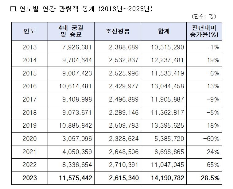 고궁과 종묘·조선왕릉 관람객은 2013년 1천31만5천290명을 기록한 뒤 꾸준히 1천만명대를 이어오다 코로나19 사태가 벌어지면서 2020∼2021년에 500∼600만명대까지 크게 줄었다.