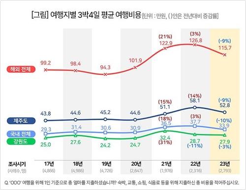 국내 여행지 전체 평균 비용은 33만9천원, 제주는 이보다 1.56배 비싼 52만8천원, 해외는 3.41배인 115만7천원으로 조사됐다.