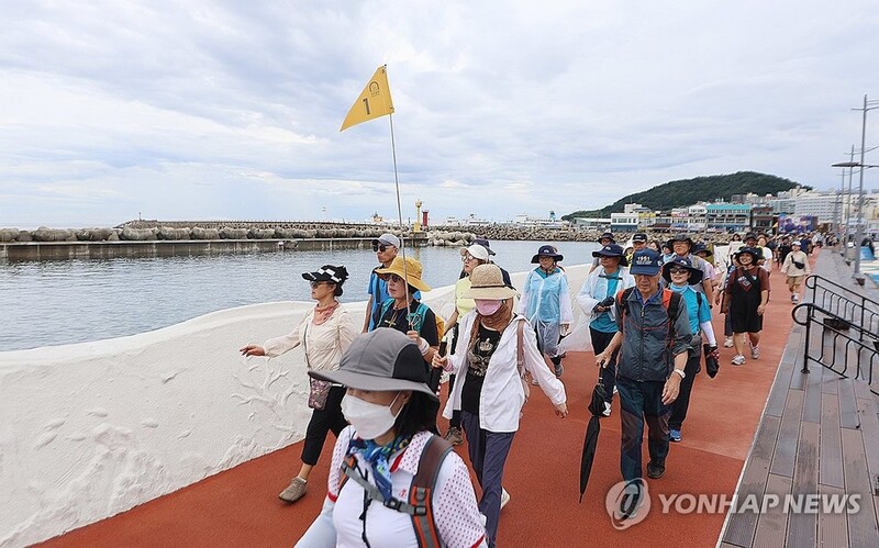▲ 제주 성안올레 걷기 축제 "함께 걸어요" (제주=연합뉴스) 변지철 기자 = '2023 성안올레 걷기축제'가 열리는 17일 오전 제주시 탑동 해안로 '탑동광장'을 참가자들이 걸으며 환하게 웃고 있다. 성안올레 1·2코스를 걸으며 제주 원도심의 다양한 문화와 역사를 느끼는 '성안올레 걷기축제'는 16∼17일 이틀간 열린다. 2023.9.17 bjc@yna.co.kr