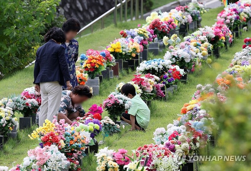 ▲ 이른 성묘 나선 시민들 (춘천=연합뉴스) 양지웅 기자 = 추석을 2주가량 앞둔 17일 강원 춘천시 동산면 군자리 춘천공원묘원에서 시민들이 이른 성묘를 하고 있다. 2023.9.17 yangdoo@yna.co.kr