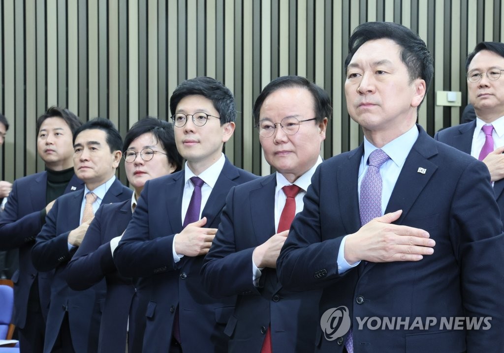 | ▲ 국기에 경례하는 국민의힘 신임 지도부 (서울=연합뉴스) 이정훈 기자 = 국민의힘 김기현 대표가 10일 오전 국회에서 열린 정책 의원총회에서 국기에 경례하고 있다. 앞줄 오른쪽부터 김 대표, 김재원·김병민·조수진·태영호 최고위원, 장예찬 청년 최고위원. 2023.3.10 uwg806@yna.co.kr |