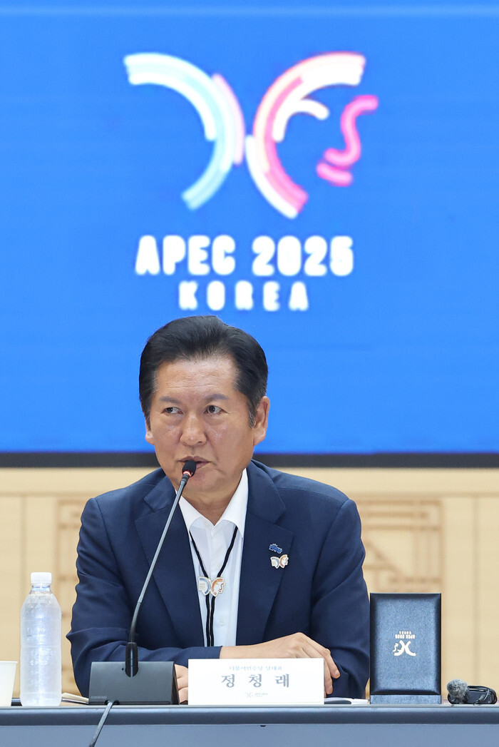 Jung Chung-rae, leader of the ruling Democratic Party, attends a meeting in Gyeongju, North Gyeongsang Province, southeastern South Korea, on Aug. 19, 2025, to receive a report on the country's preparations for this year's Asia-Pacific Economic Cooperation forum summit that is set to take place in the city from Oct. 31 to Nov. 1. (Yonhap)