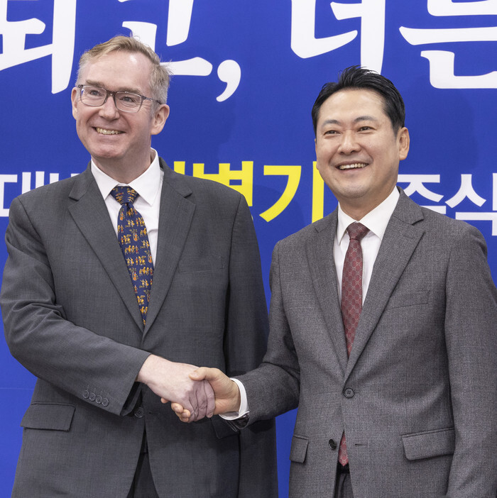 Jang Dong-hyeok (R), leader of the main opposition People Power Party, poses for a photo with British Ambassador to South Korea Colin Crooks prior to their meeting at the National Assembly in Seoul on Oct. 28, 2025. (Yonhap)